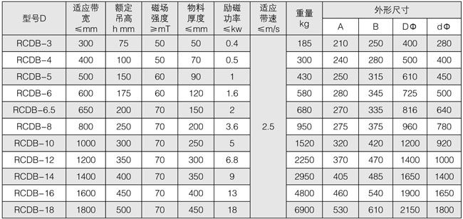 RCDB系列干式電磁除鐵器(亦稱PDC系列盤式)是一種用于清除粉狀或塊狀非磁性物料中雜鐵的除鐵裝置。其內(nèi)部采用電工專用樹脂澆注,自冷式全密封結(jié)構(gòu)。具有透磁深度大、吸力強、防塵、防雨、耐腐蝕等特點,在其惡劣的環(huán)境中仍能可靠運行。 其主要性能指標(biāo)均達(dá)到或高于JB/T7689-95標(biāo)準(zhǔn)要求,該產(chǎn)品可除去混雜在非磁性物料中0.1-25公斤的鐵磁性物質(zhì)。
